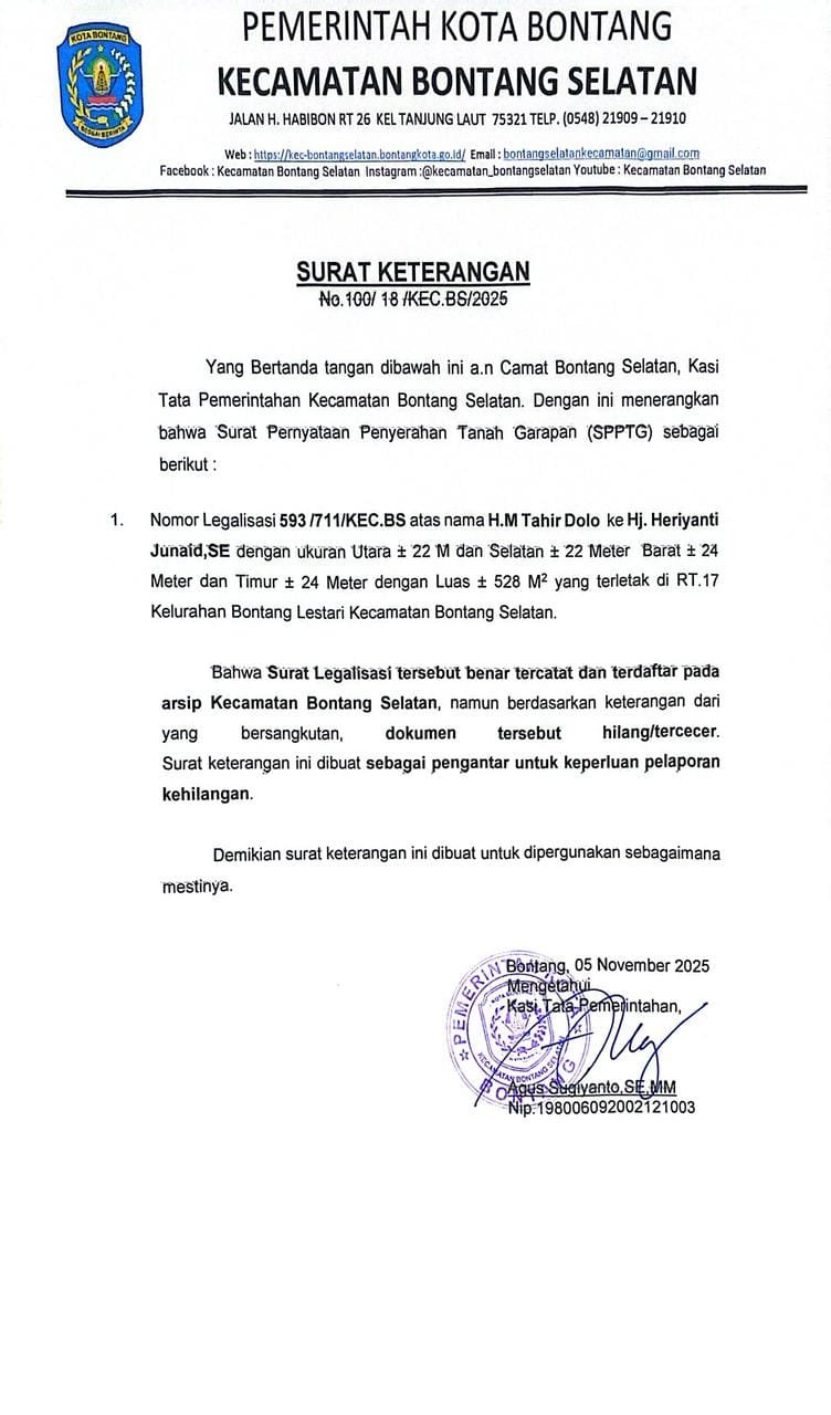 Sertifikat yang hilang dengan Nomor Legalisasi 593 /711/KEC.BS atas nama H.M Tahir Dolo ke Hj. Heriyanti Junaid,SE dengan ukuran Utara 22 meter dan Selatan 22 Meter Barat 24 meter dan Timur 24 meter dengan Luas 528 meter.