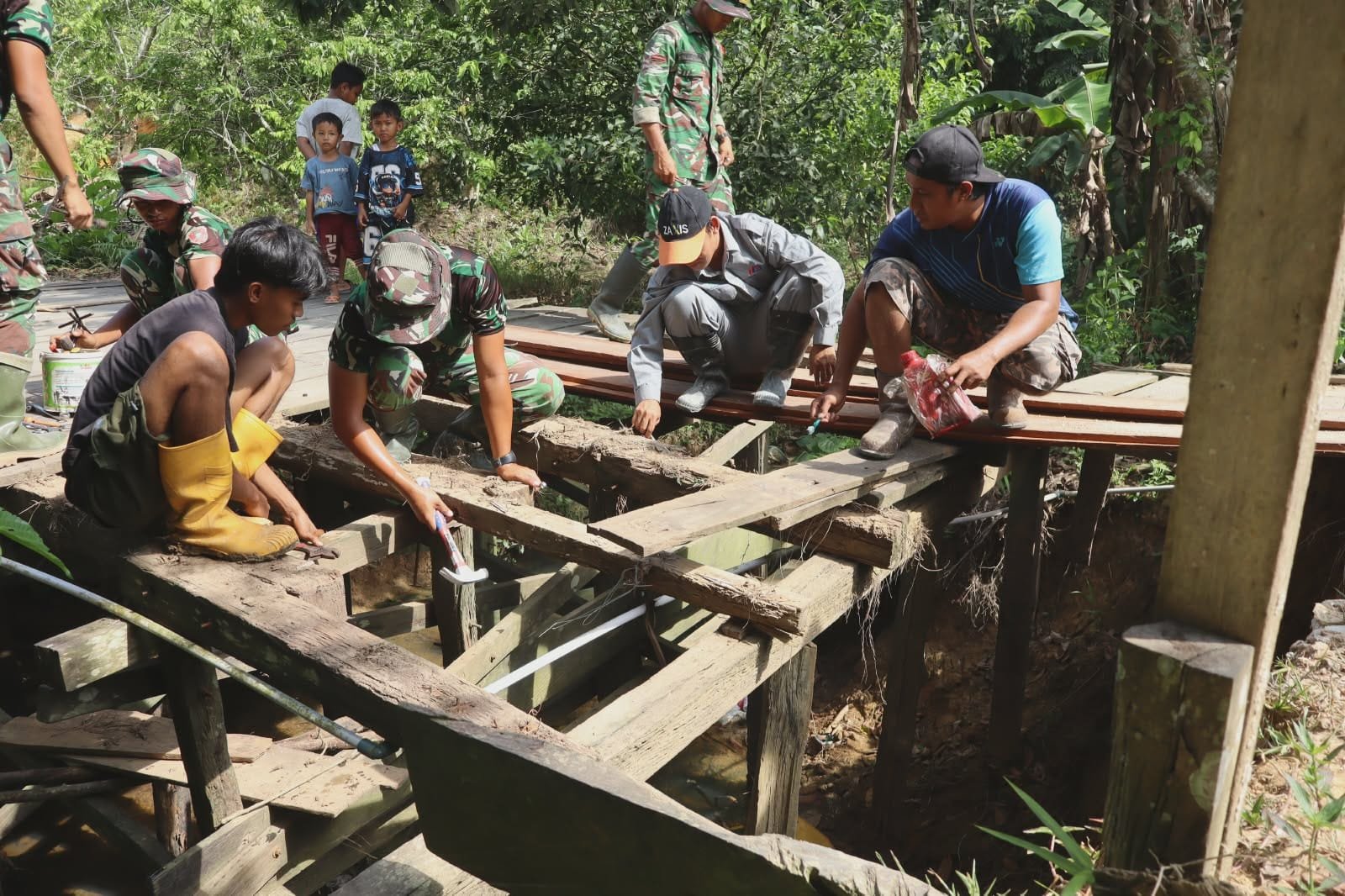 Sejak Minggu (26/04/2026) pagi, personel Satgas TMMD bersama warga tampak bahu-membahu menyusun bronjong kawat yang diisi batu. Suasana gotong royong begitu terasa, dengan ritme kerja yang kompak dan penuh semangat.