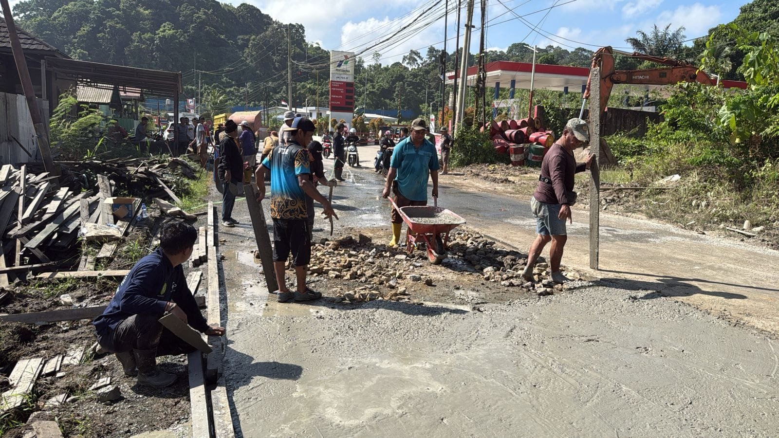 Sejak pagi, warga terlihat kompak. Ada yang mengumpulkan material, ada pula yang langsung menambal jalan secara bergiliran. Suasananya sederhana, tapi terasa penuh kebersamaan.