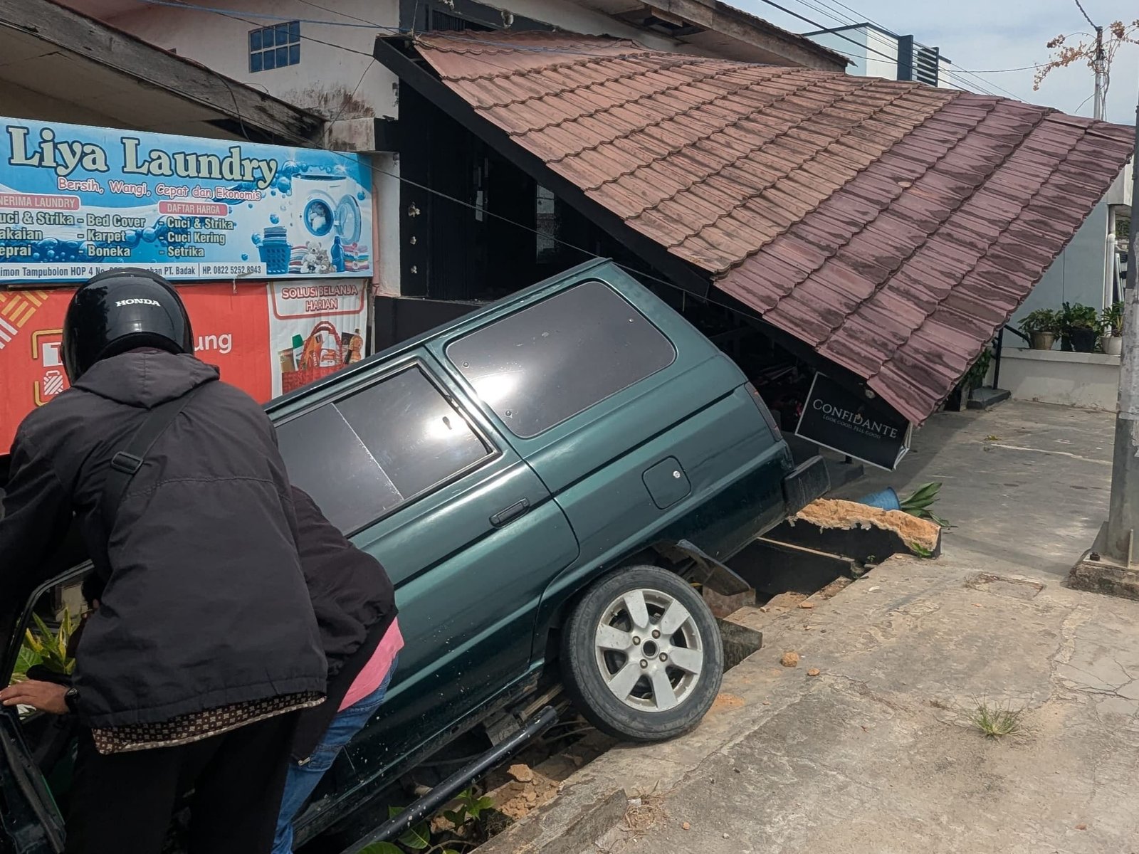 “Tiangnya roboh, terus atap depan ikut jatuh. Mobilnya juga sampai masuk ke samping bangunan,” jelasnya.